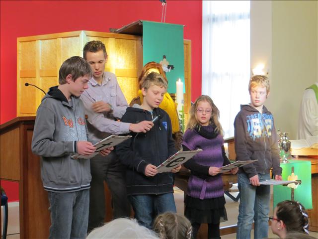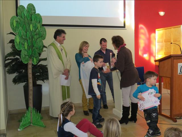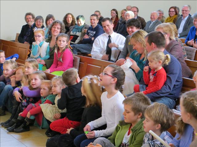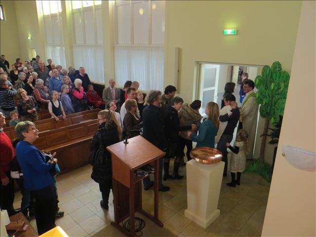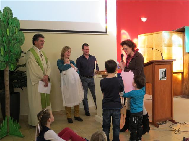 Een echte gezinsdienst was het op 3 februari, want er waren veel gezinnen en in ieder geval heel veel kinderen. Kinderen van gemeenteleden, maar ook veel neefjes en nichtjes van Tess, dochter van Rob en Joke Kik, die deze ochtend gedoopt werd.