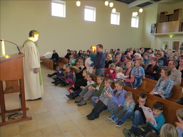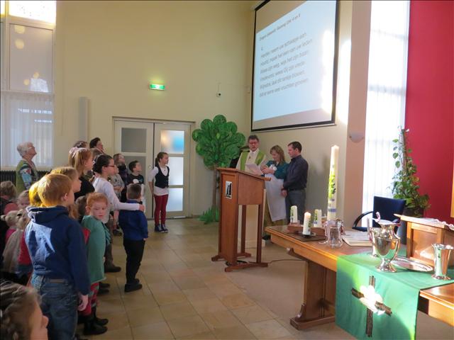De geboorte en de roeping van Samuel stonden centraal in de schriftlezing en de verkondiging, die als thema “Leven dicht bij God” mee kreeg. Hierna werd Tess door alle kinderen de kerk binnengebracht en dat ging niet ongemerkt voorbij……
